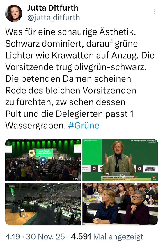 (…) “Was für eine schaurige Ästhetik“, klagt eine der Mitgründerinnen entsetzt. “Schwarz dominiert, darauf grüne Lichter wie Krawatten auf Anzug“ bemängelt Jutta Ditfurth beim Blick auf die Bilder der Inszenierung des Parteitages, der die Grünen zurückführen soll zu einer realistischen Machtperspektive. “Die Vorsitzende trug olivgrün-schwarz“, ätzt die frühere Führerin der Parteilinken. Sie habe zudem betende Damen gesehen, die die Rede eines bleichen Vorsitzenden zu fürchten schienen, “zwischen dessen Pult und die Delegierten ein Wassergraben“ passe.
